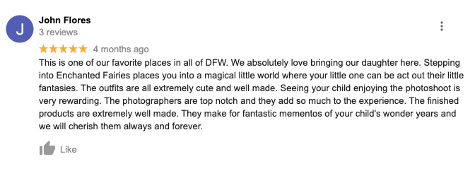 Enchanted Fairies is a family-run unique portrait experience in the Dallas area that caters to the imagination of each child that visits our studio. From the first step into Enchanted Fairies, children are transported to a fairytale land full of wonderment, and laughter. This means each session at Enchanted Fairies is a magical and interactive fun-fest!