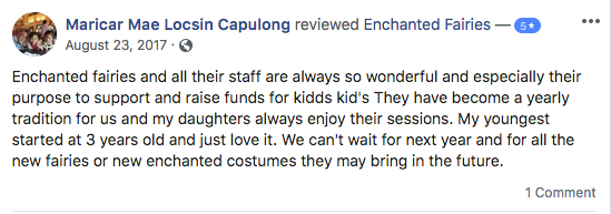 Your family, if you have taken advantage of one of our charity events, will receive one free Limited Edition 8X10 portrait per 365 day period. Only one per household and understandably it can not be combined with other offers. It is part of our special mission to raise funds for children’s charities while going above and beyond for our clients. Not only do guests get to experience the immersive magic of an Enchanted Fairies session, you get to have access to our high end, gorgeous wardrobe, flower crowns, tiaras, pixie dust and fairy wings. You get to have an incredible interactive session with our certified Enchanted Fairies portrait artists. Best of all, all the proceeds from your $25 per child all goes to charity, we keep nothing. To go above and beyond, we want your family and every family who enters our studio, to walk away with one free 8X10, no obligation.We can not wait to serve you and your child.